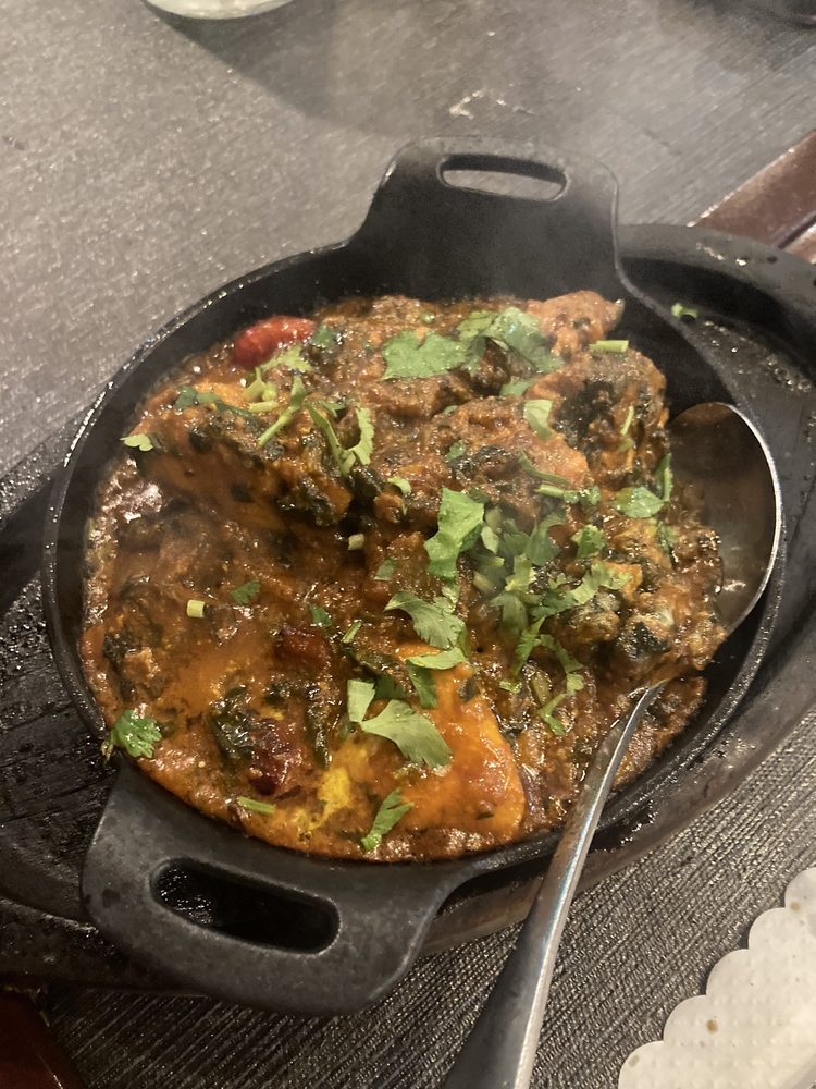 Big size marinated shrimp cooked in clay oven, served with fresh spinach. Served with basmati rice.