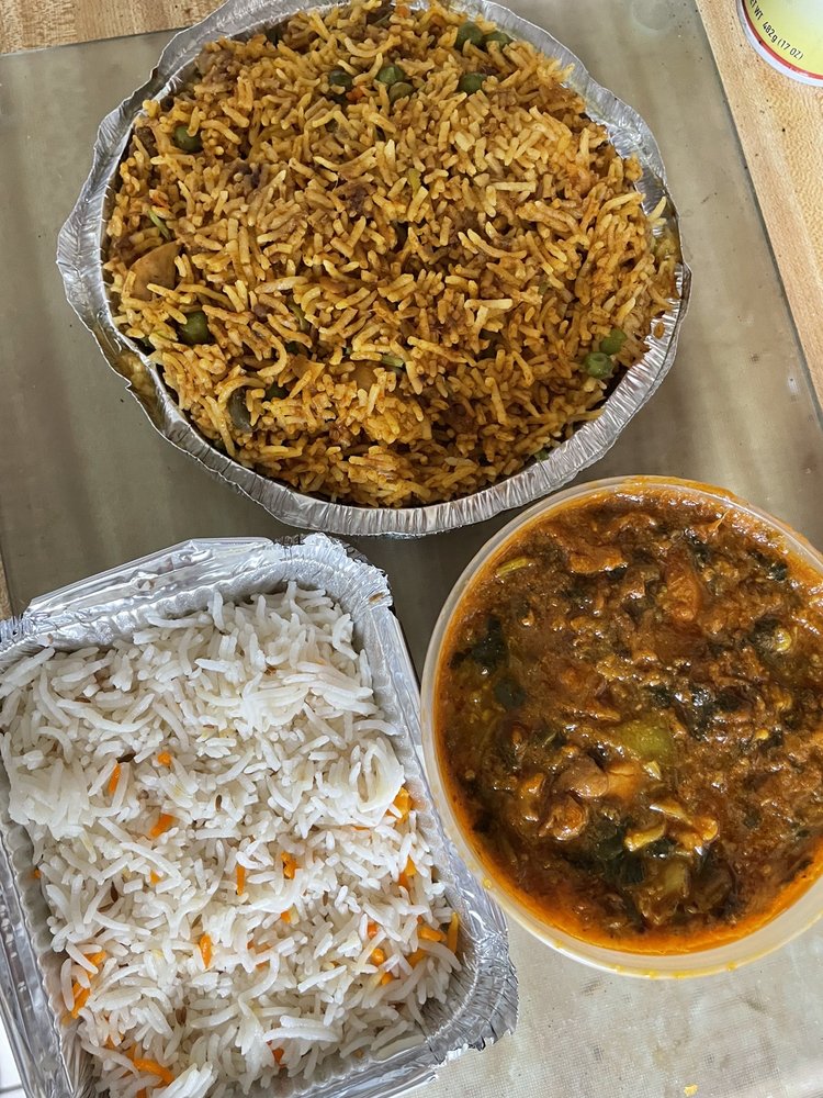 Choice of one vegetable curry and one meat curry, includes two rice, two bread and two rice puddings. Served with basmati rice.