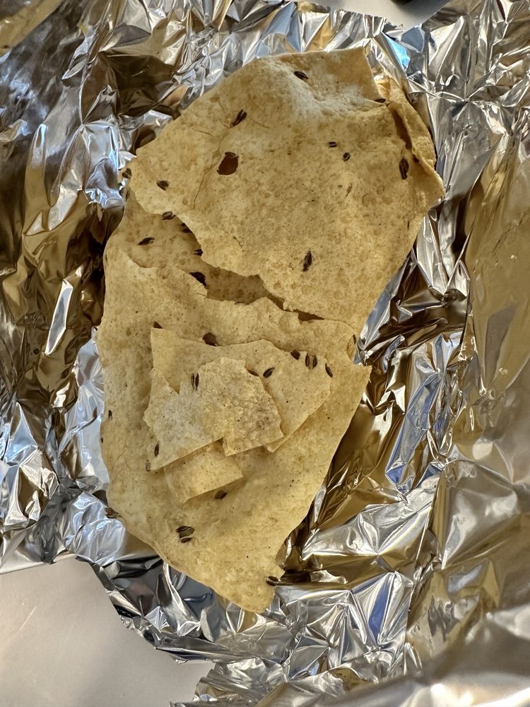 Smashed samosa served over bed of chickpeas topped with yogurt mint and tamarind sauce
